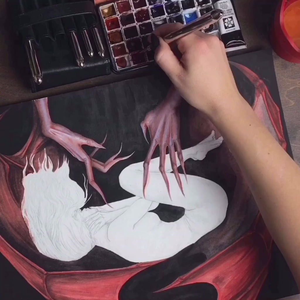 Not all of us are protected by Angels, sometimes Demon is much more caring and stronger ... And dearer ... While I was drawing this, the phrase from the poem by Sola Monova did not leave my head: "Darkness inside of you, But I care about you ..." ("Тьма у тебя внутри, Но я о тебе забочусь")... I have only few works about my personal and intimate, about me. This is one of them.